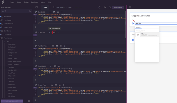 In our newly created block, we will click on "CMS configuration", on the right-hand side we'll search for the hCaptcha snippet.